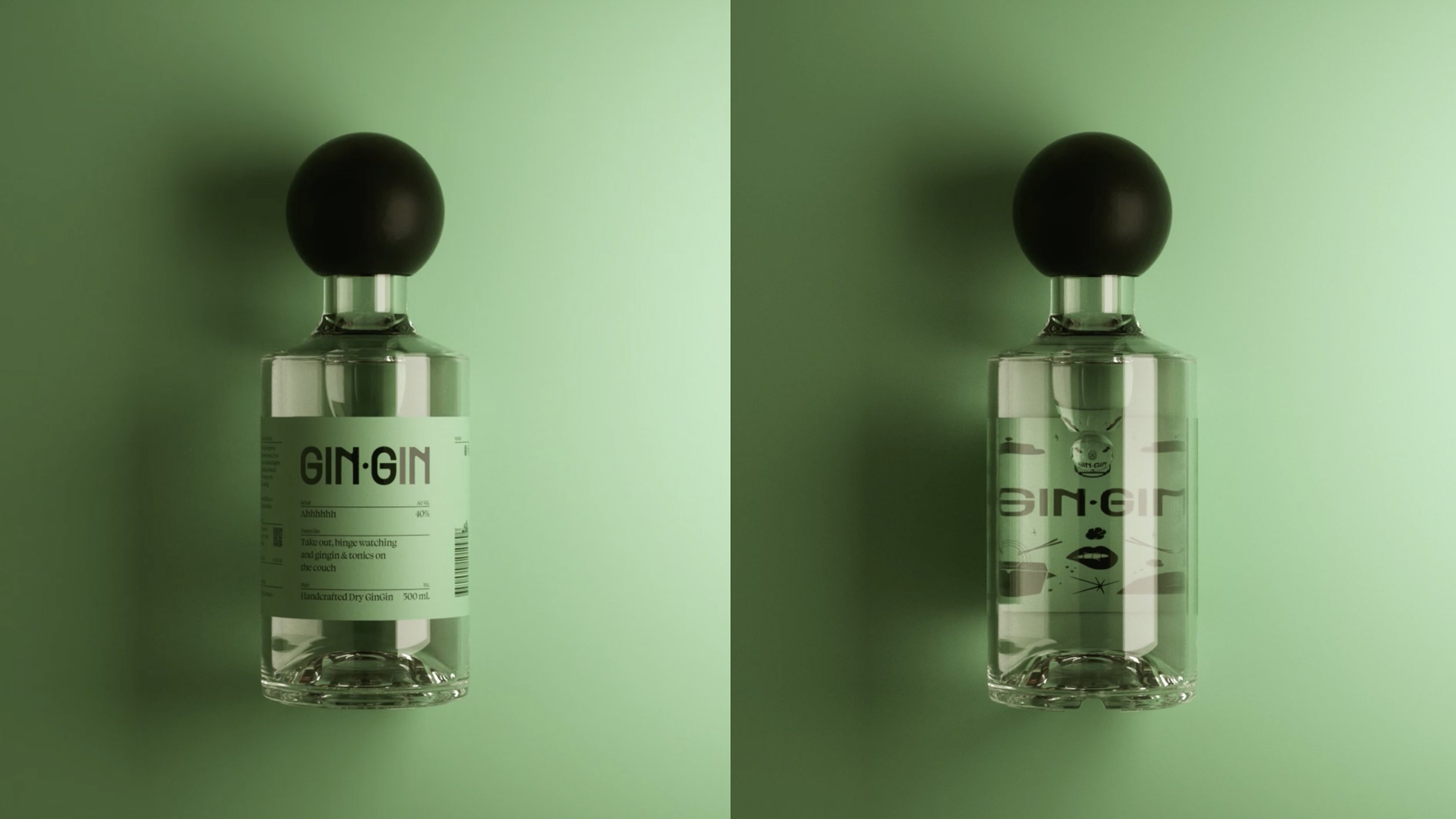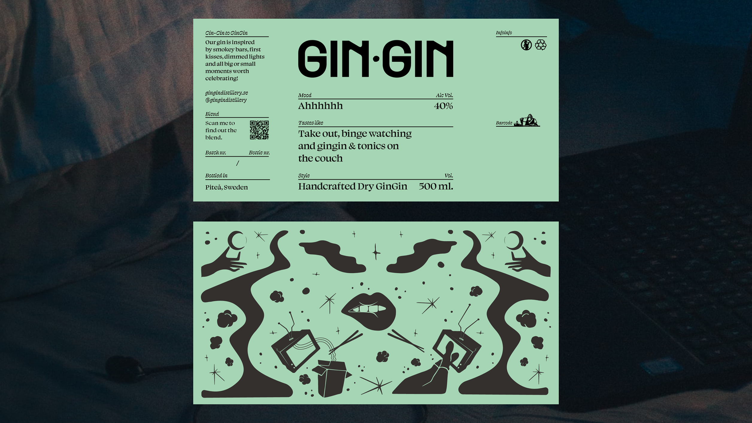 För att få till en lekfull tonalitet valde vi att jobba mycket med upprepningar. Vi snackar om Tom Colliolins, Happy Hourour och Chin Chin. Lekfullt, sexigt och mysigt går igen även i designen av flaskan och etiketten. Vi leker med upprepningar i form av spegelvända illustrationer. Men mest av allt vill vi att GinGin ska förmedla en känsla. Känslan av en första kyss, din väns skratt och blicken som din flört ger dig på dansgolvet.