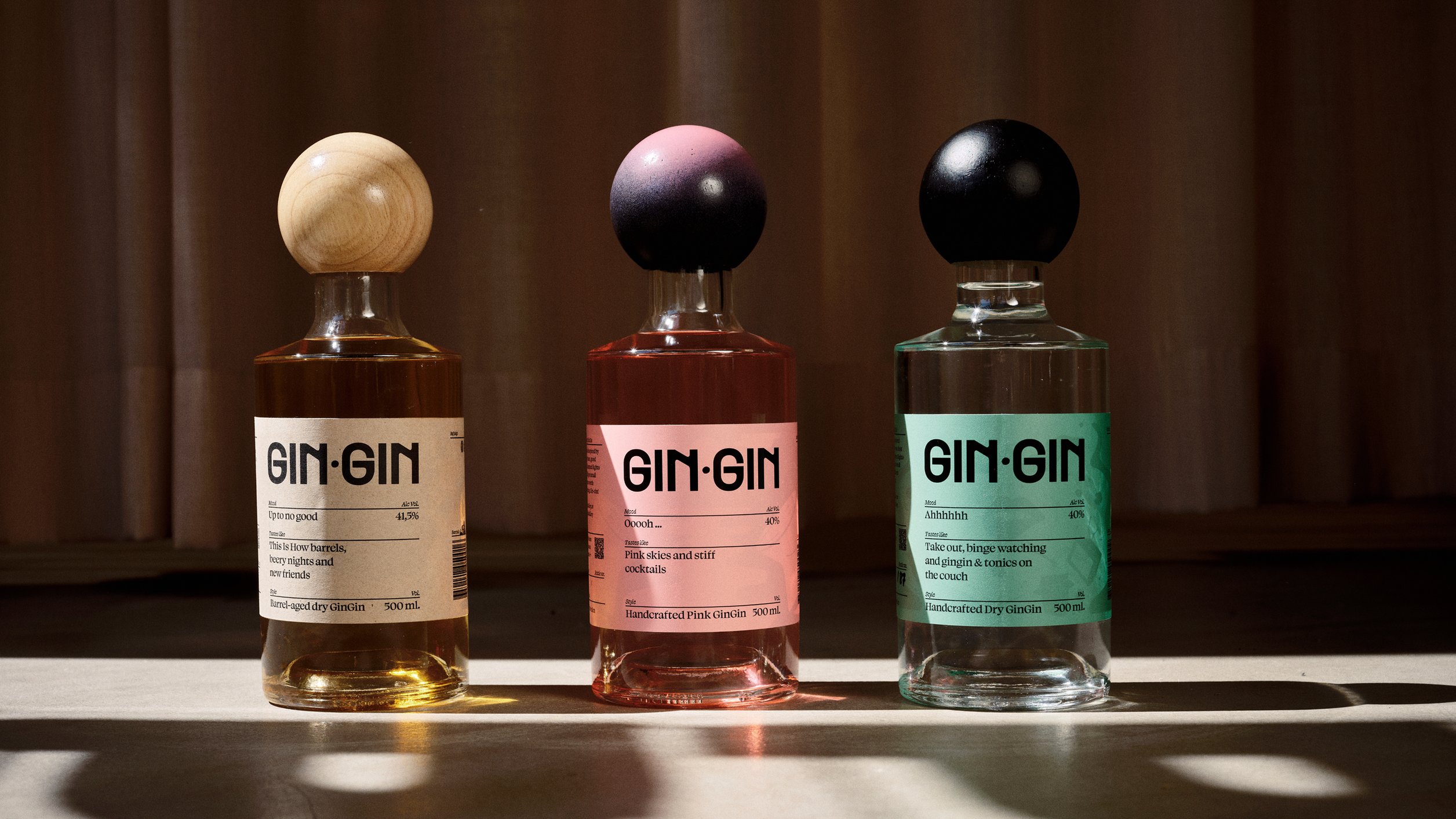 Smaken av en salt överläpp, en rosa himmel och ljudet av ett asgarv. När vi skapade en identitet åt ginvarumärket GinGin satte vi känslan i första rummet. Resultatet blev ett lekfullt varumärke och en dödssnygg flaska.