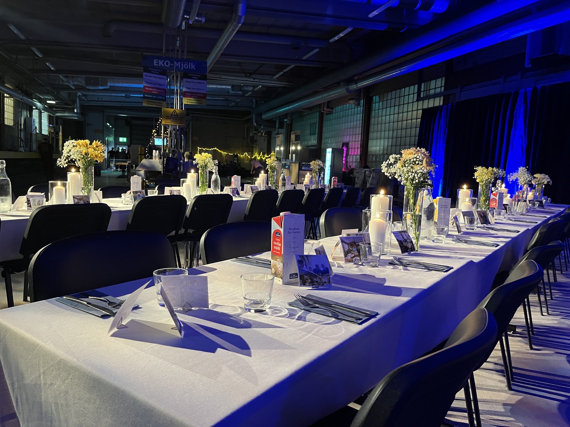 Menyerna trycktes, såklart, på mjölkpaket – och borden dekorerades med bilder på kollegor och minnen från åren tillsammans. Under kvällen blev det quiz, videohälsningar från personer med koppling till mejeriet och ett dansgolv som höll igång långt in på natten.